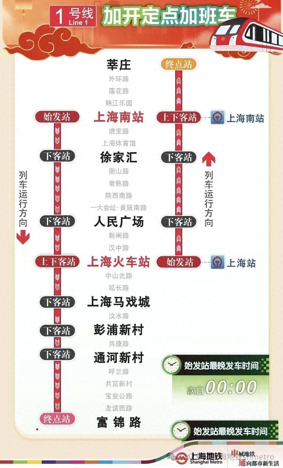 为满足春运期间乘客夜间出行需求,今晚(2月23日),1号线加开定点加班车,上海南站站往富锦路站加开至次日(2月24日)0时,上海火车站站往莘庄站加开至次日(2月24日)0时 ;