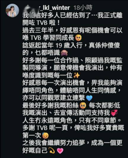 如今在TVB待了不到4年便选择离巢追梦,不少前辈如黄建东、谢东闵、焦浩轩、袁伟豪,以及前TVB金牌监制梅小青等都留言为她加油,早前离巢的蔡志恩也留言鼓励:“江湖见!其实很快再见!”